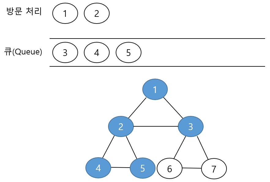 큐에서 2를 꺼낸 직후에는 그 인접한 노드는 3, 4, 5중에서 1과 3은 이미 방문한 적이 있으므로 넘어가고 4와 5를 큐에 삽입합니다. 그 결과 형태는 위 그림과 같습니다.
