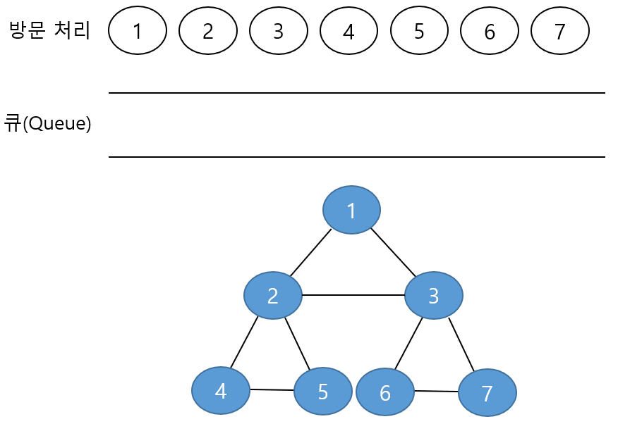 이후에 노드 3을 큐에서 꺼낸 뒤에 방문처리해주고, 3과 인접한 노드인 6과 7을 큐에 삽입합니다. 노드 1과 2는 방문한 적이 있으므로 6과 7만 큐에 넣어주면 됩니다. 따라서 위와 같이 기본적으로 모든 노드가 방문처리가 되었습니다. 이제부터 남은 노듣들을 큐에서 꺼내주기만 하면 됩니다.