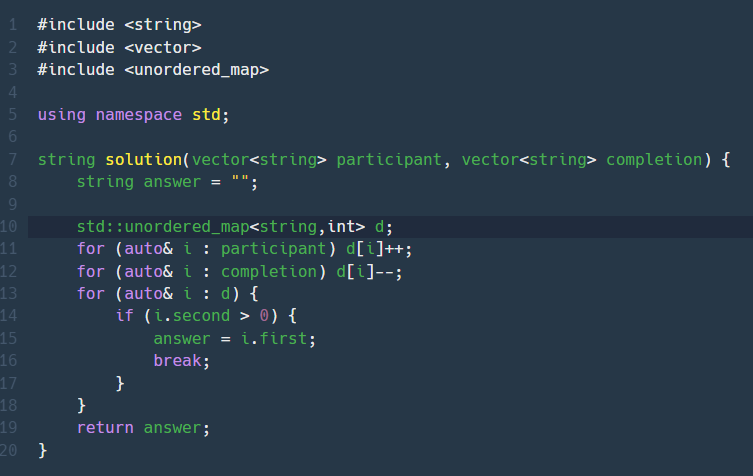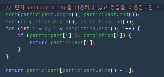 우리는 완주하지 못한 참여자가 단 한명이라는 조건을 가지고 있으므로 participant 와 completion vector를 정렬한 후 루프문을 돌려 해당 키값이 서로 같지않다면 그 참가자는 완주하지 못했다고 생각할 수 있겠죠 ?