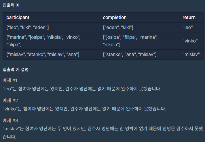 마라톤에 참여한 선수들의 이름이 담긴 배열 participant와 완주한 선수들의 이름이 담긴 배열 completion이 주어질 때, 완주하지 못한 선수의 이름을 return 하도록 solution 함수를 작성해주세요.