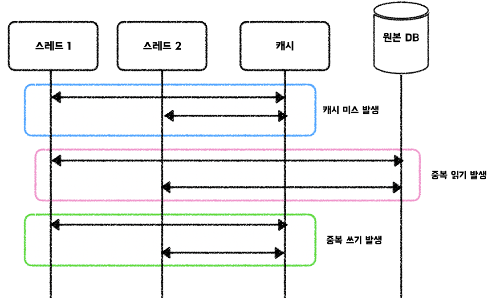 잠금(Locking) 방식은 한 요청 처리 스레드가 해당 캐시 키에 대한 잠금을 획득합니다. 이로인해 다른 요청 처리 스레드들은 잠시 대기합니다. 잠금을 획득한 스레드는 사용자 요청에 응답하는 과정동안 캐시 적재 작업은 비동기 스레드로 처리할 수 있습니다. 잠금을 사용하기 때문에 성능 저하 가능성이 존재하며, 잠금 획득 스레드의 실패, 잠금의 생명 주기, 데드락 등 다양한 상황을 고려해야한다는 단점이 존재합니다.